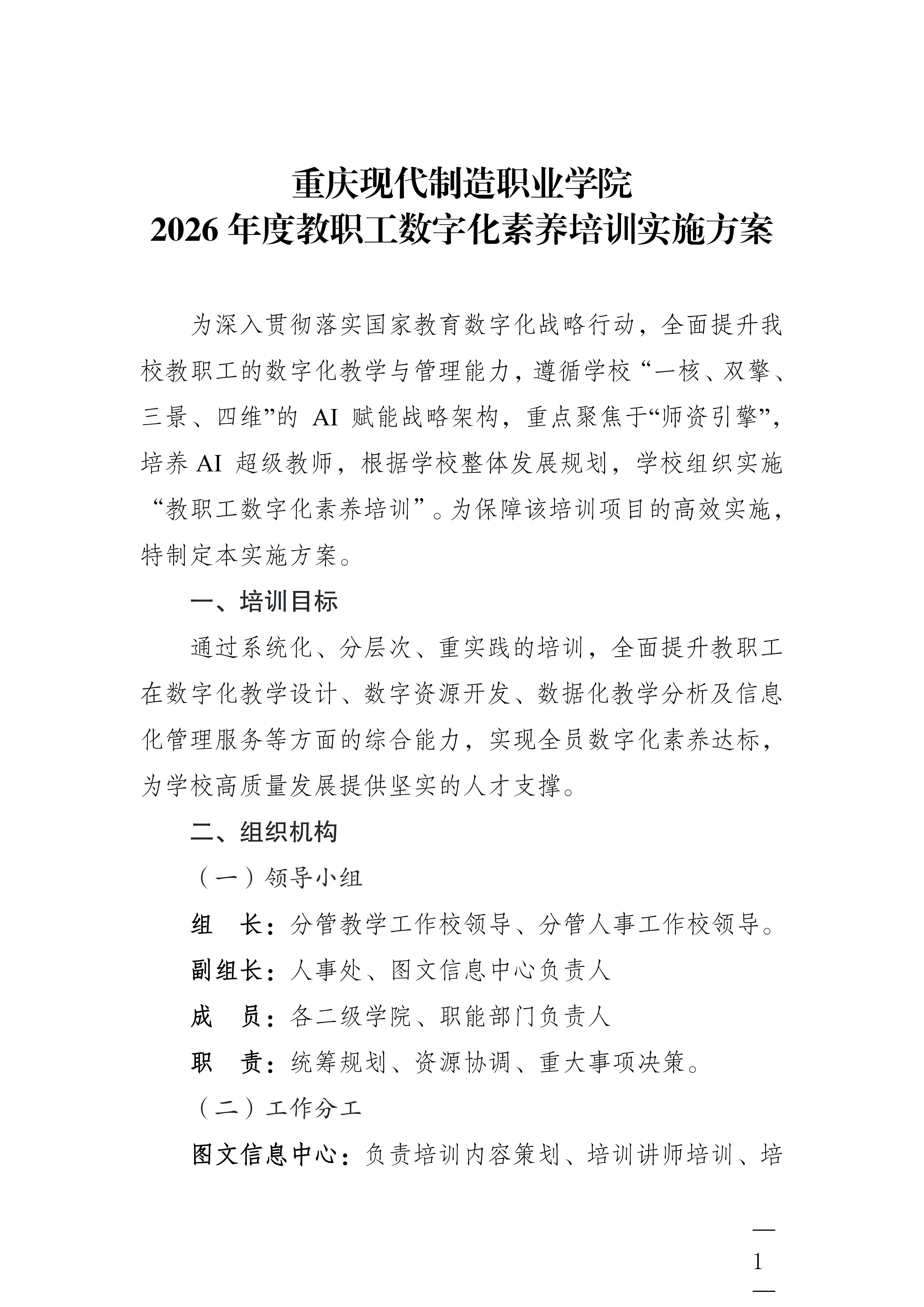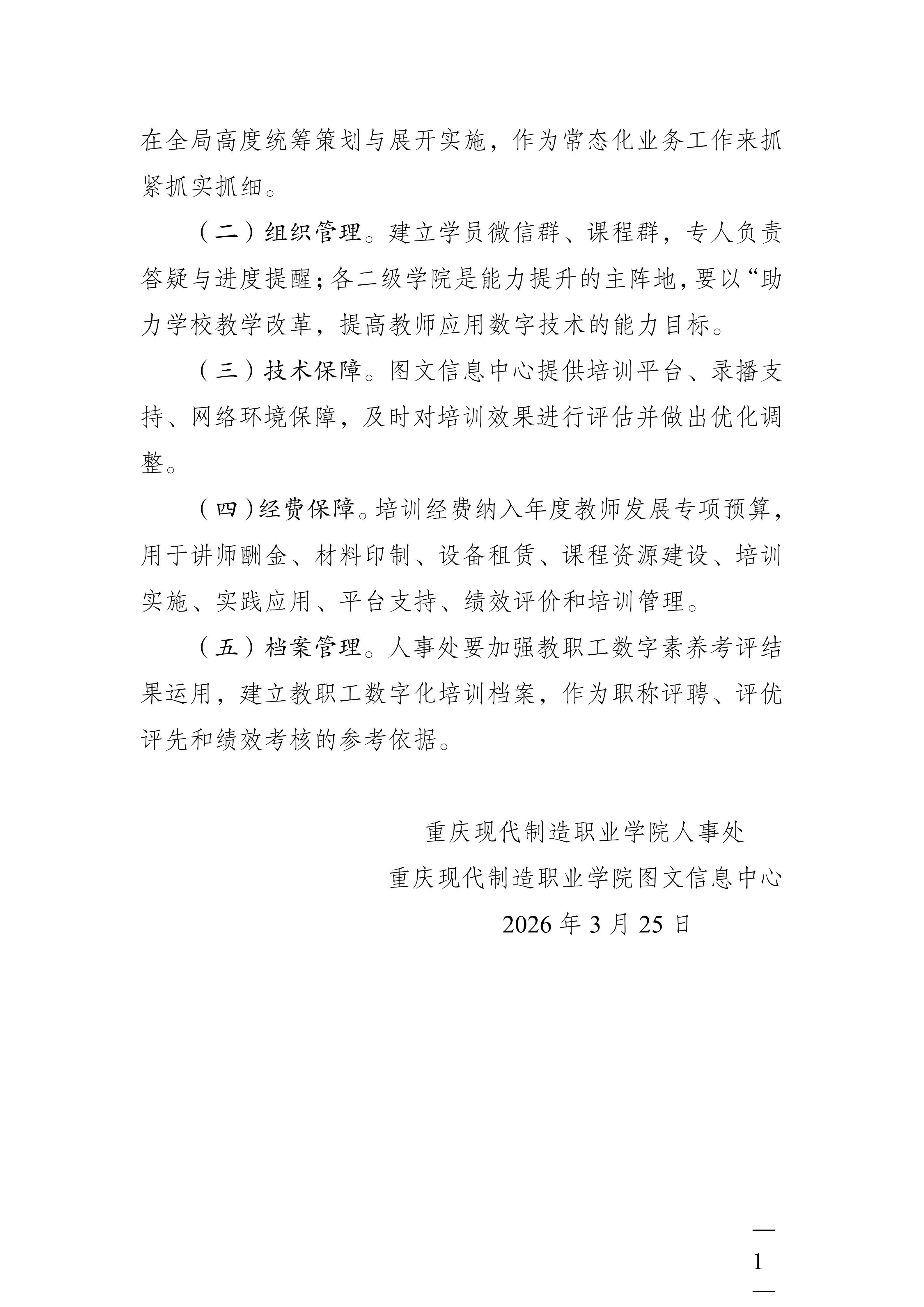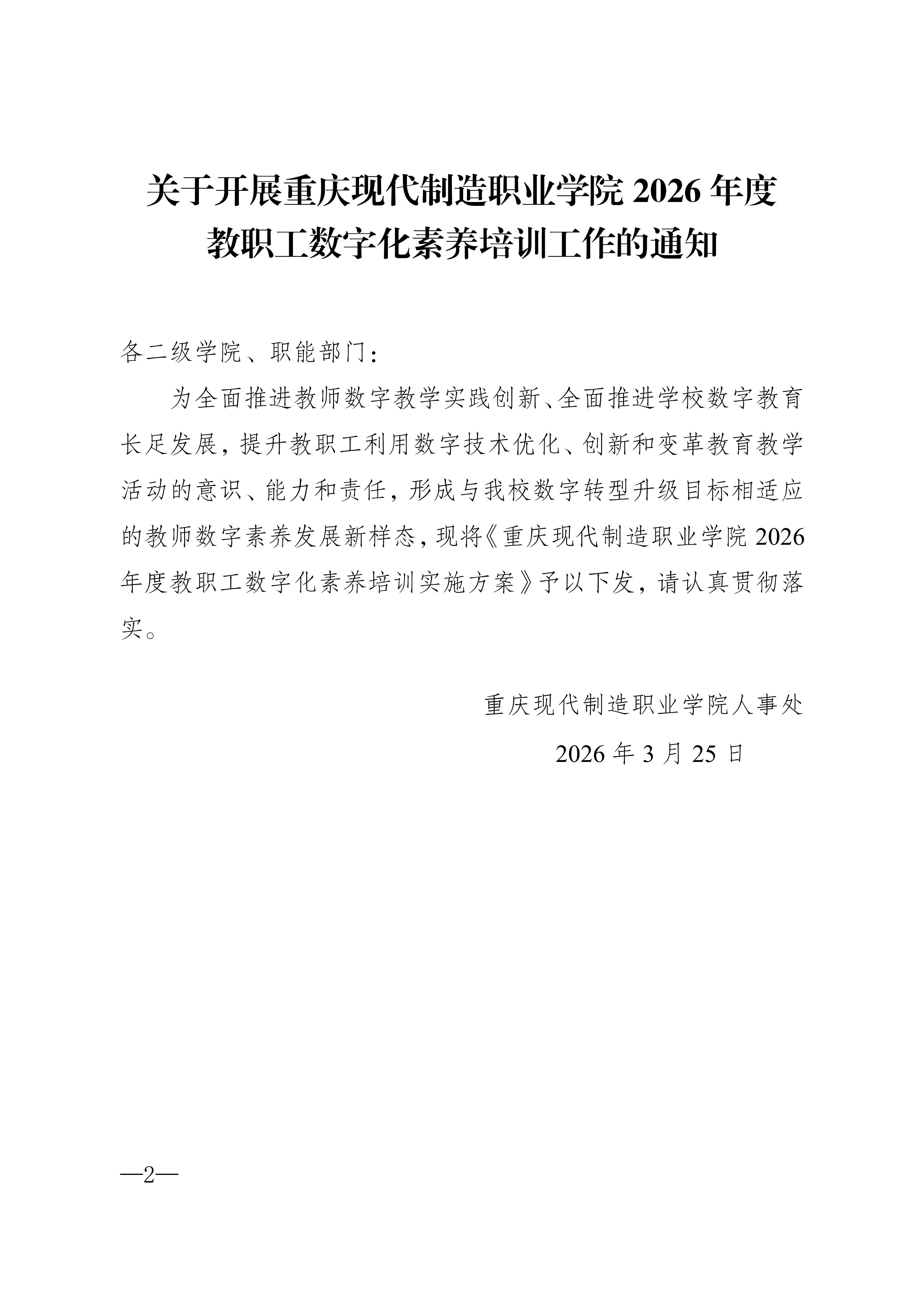 关于开展重庆现代制造职业学院2026年度教职工数字化素养培训工作的通知